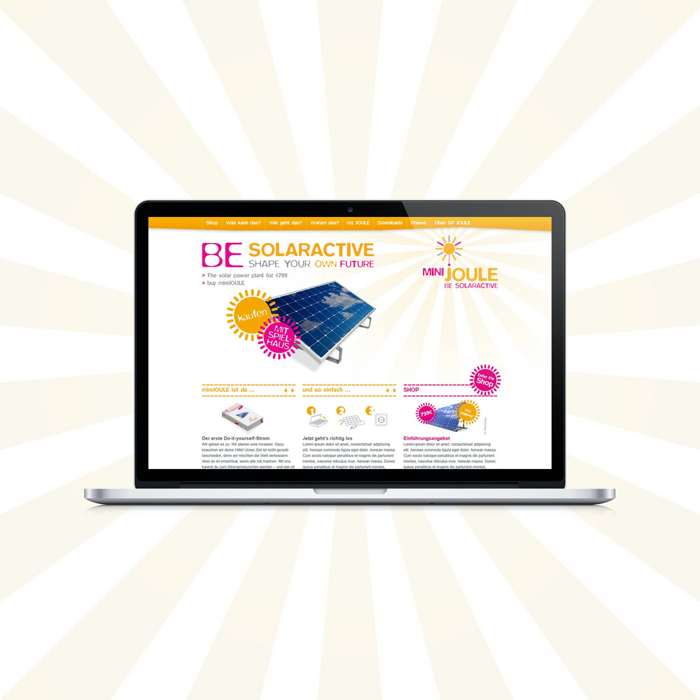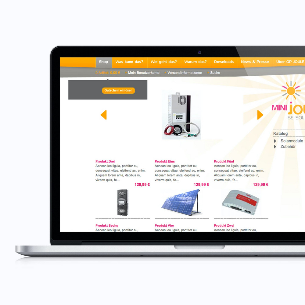 Eine absolute Weltneuheit ist das miniJOULE: Jeder kann die kleine Solaranlage bei sich im Garten selbst zusammenbauen und aufstellen, um aus Sonne Gratis-Strom zu erzeugen. Die Solarsets und das passende Zubehör sollen exklusiv in einem Online-Shop verkauft werden. Daher galt es, ein einfaches, kompaktes Shop-System – basierend auf dem von HOCHZWEI gestalteten Corporate Design – zu programmieren, um so Vertrieb und weitere Informationen in einem ansprechenden, mehrsprachigen Internetauftritt zu bündeln.