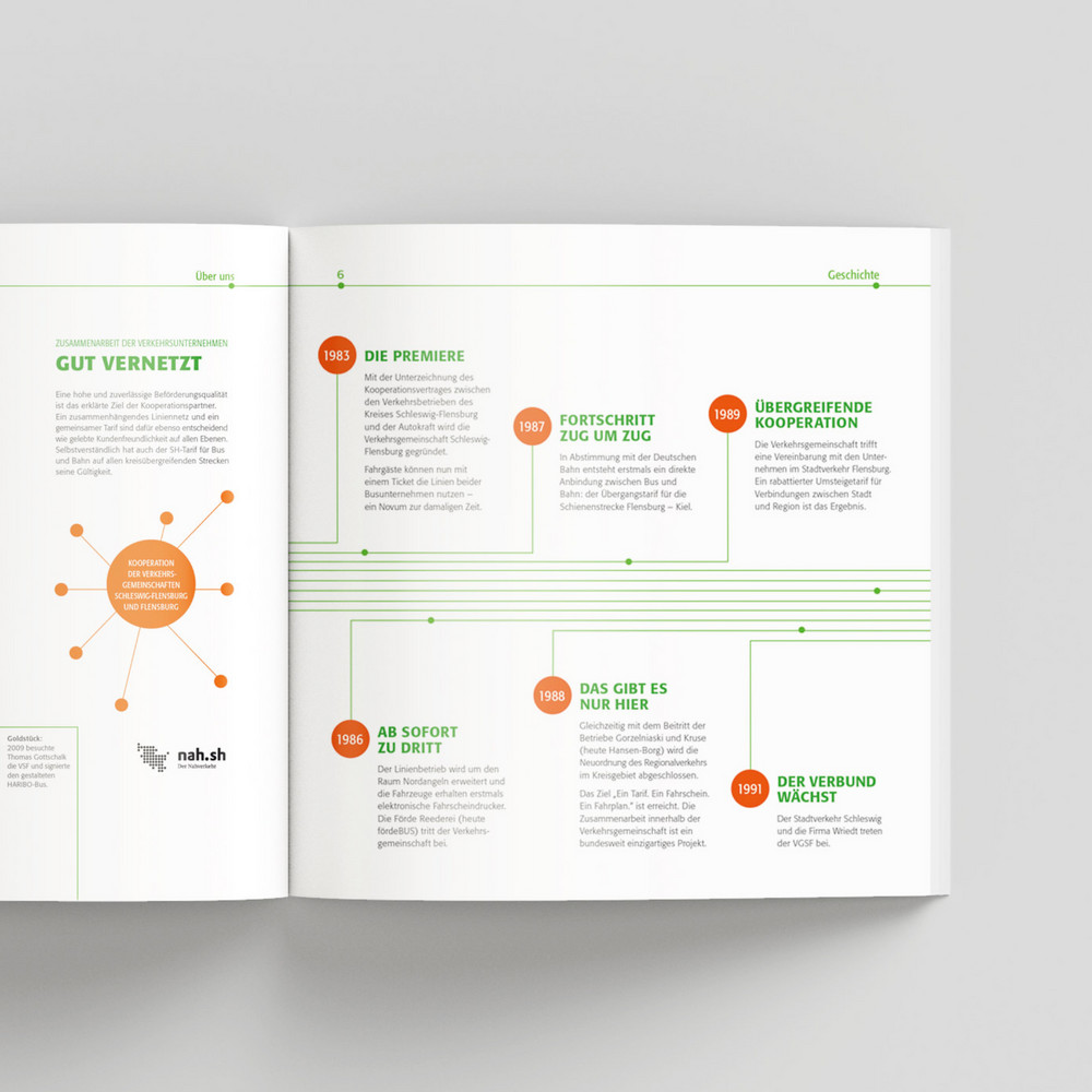Das 30-jährige Bestehen der Verkehrsgemeinschaft Schleswig-Flensburg sollte mit einer Reihe von Werbemaßnahmen begleitet werden. In deren Mittelpunkt stand ein Freifahrttag am 25. September. HOCHZWEI wurde beauftragt, ein passendes Grundmotiv zu entwickeln und dieses auf Postkarten, Plakaten, Aufklebern, Großflächen und T-Shirts entsprechend umzusetzen. Zudem sollte die ereignisreiche Geschichte sowie die aktuelle Lage der Gemeinschaft in einer 16-seitigen Imagebroschüre ansprechend dargestellt werden.