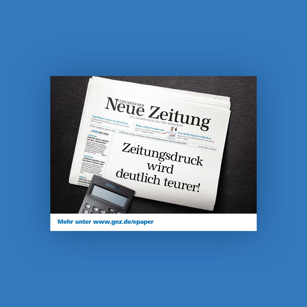 Lieber den Preis erhöhen als die Qualität senken, mit diesem Anspruch will die GNZ als Lokalzeitung für den Main-Kinzig-Kreis angesichts massiv gestiegener Produktionskosten weiterhin für Ihre Leser da sein. Dies in Form einer Kampagne ebenso sympathisch wie ehrlich zu kommunizieren, lautete der Auftrag an HOCHZWEI. Gleichzeitig sollte auf die Option eines Wechsels von der gedruckten Ausgabe zum konstant günstigeren ePaper hingewiesen werden, das zudem in neuer Version mit verbesserten Funktionen aufwartet.