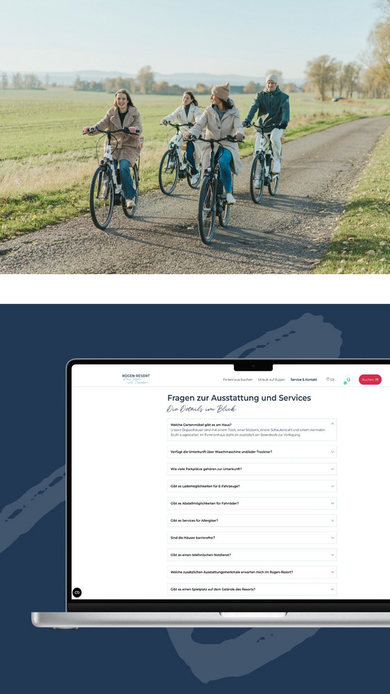 Einst als Immobilienprojekt gestartet, wurde die zentral zwischen Rügener Bodden und Ostsee neugebaute Anlage aus Doppel- und Familienhäusern final in ein Ferien-Resort umgewidmet. Da der bestehende Onlineauftritt infolgedessen noch zu wenig Urlaubsemotionen transportiert hatte und sich darüber hinaus auch das Buchungserlebnis und die bisherige Vermarktung als ausbaufähig erwiesen, wurde HOCHZWEI mit einem Relaunch beauftragt. Unter neuen, touristischen Vorzeichen stand dabei auch das bisherige Design noch einmal auf dem Prüfstand, wobei der Wiedererkennungswert erhalten bleiben sollte. Im zweiten Schritt sollte eine Onlinemarketingstrategie erarbeitet und umgesetzt werden.