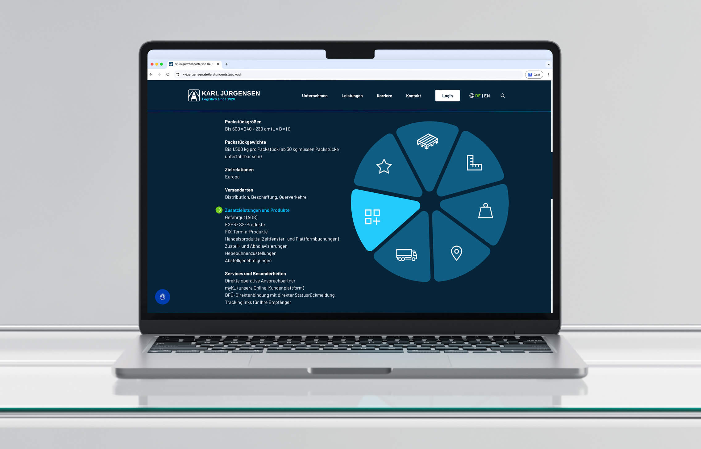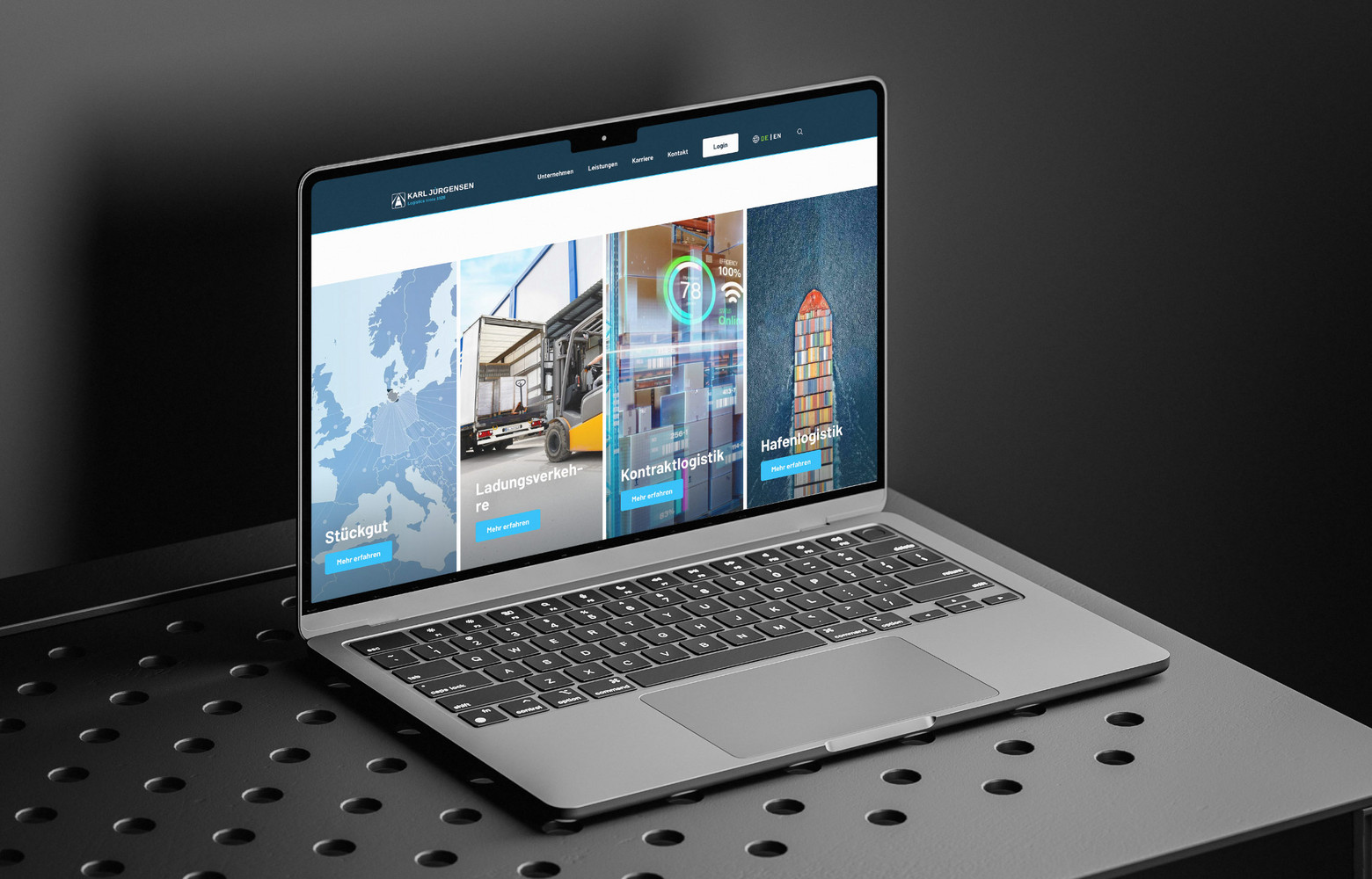 KARL JÜRGENSEN gilt mit über 90 Jahren Erfahrung und Know-how als Vorreiter in der Speditions- und Logistikbranche. Der Anspruch des Logistikdienstleisters ist neben exzellenter Qualität und zukunftsfähiger Unternehmensentwicklung auch, langfristige Kunden- und Mitarbeiterbindungen aufzubauen. Mit einer optimierten Benutzererfahrung, modernem Look und intuitiver Navigation sollte der Internetauftritt technisch, inhaltlich sowie optisch auf einen zeitgemäßen Stand gebracht werden. Die langjährige Zusammenarbeit zwischen HOCHZWEI und KARL JÜRGENSEN war die ideale Basis für die Entwicklung eines zukunftsorientierten digitalen Auftritts.